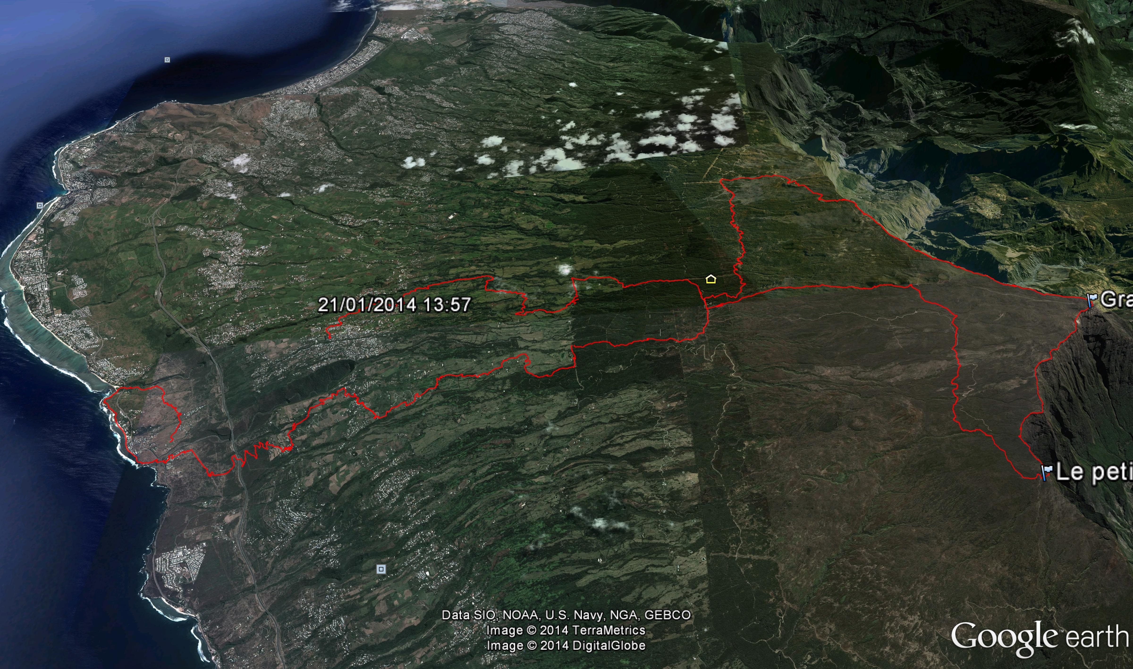 Montée PANON, savane, terrain BANG spot de surf, chemin du conservatoire, passer la grande ravine piveteau, chemin canne, chemin HIBON, Chemin Pâturage NODODUS, SADEYEN, chemin HIBON, Pâturage CONTAU, foret cryptomerias, chemin VAUDEVILLE. Ligne de la Grande ravine, Piste forestière, passer le puits de glace, prendre à droite le sentier de la glacière 7en direction de Piton rouge, à l’intersection prendre à gauche vers la caverne du roi Phaonce, rejoindre le sentier du petit Bénare et prendre à gauche. Monter jusqu’au Grand-Bénare, passer l’antenne. Engager la descente par la droite, le long du rempart de Mafate sur le sentier du grand bord à la première intersection prendre à gauche et descendre vers la Glacière. suivre le sentier de la Glacière par la piste, passer l’observatoire de l’air, prendre à gauche le sentier vers la tour de guet.Rejoindre la piste OMEGA par le sentier VTT et continuer jusqu’au gîte des tamarins, prendre le pare feu Mont-Vert prendre la piste dans les pâturages THOMAS, GRONDIN prendre le chemin bétonné à droite, continuer jusqu’à la ferme CAROUPIN, PAYET, de bus, Chemin des limites, à droite chemin canne, chemin MAUSOLE, z a c, parcours de santé, monter tout droit Route Victor HUGO, place de l’Eglise ARRIVE