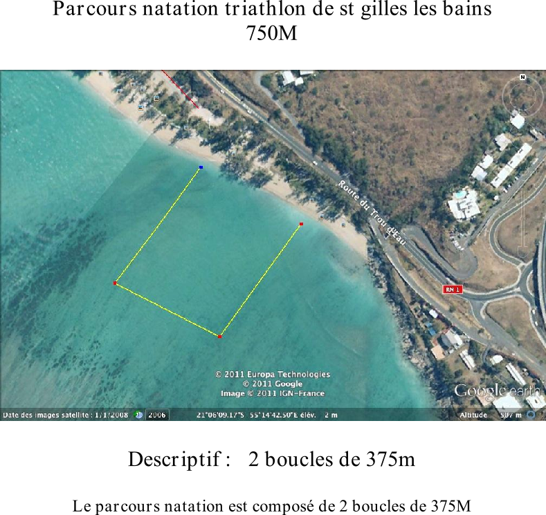 Le départ sera donné depuis la plage de Trou d’eau à la Saline les bains. Les nageurs devront contourner 2 bouées en direction de la barrière avant de rejoindre la plage. 2 tours seront réalisés afin d’effectuer un parcours de 750m.