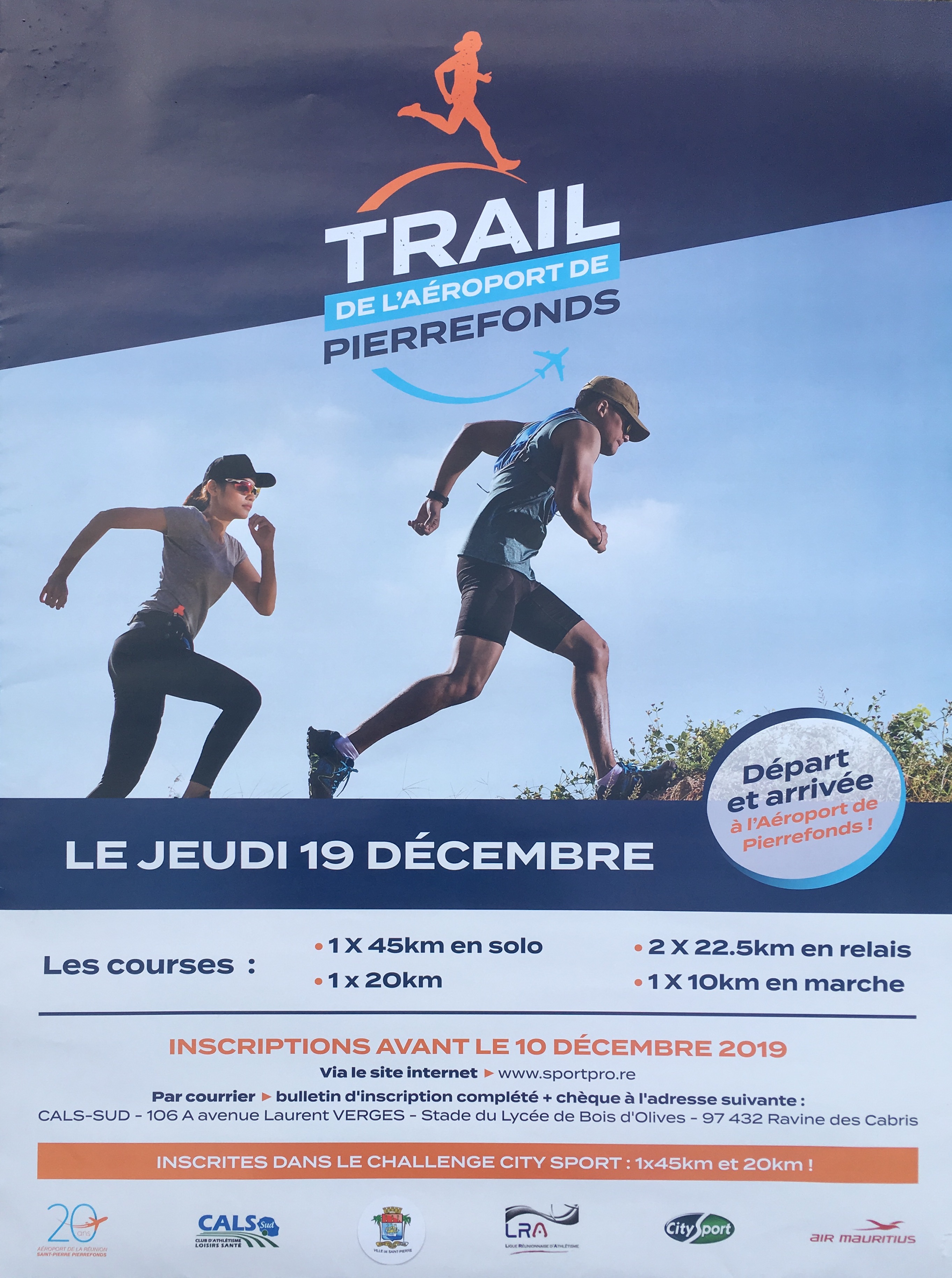 Le Club d’Athlétisme Loisirs et Santé du Sud (CALS Sud) organise la 1ère édition du Trail de l’Aéroport de Pierrefonds le 19 décembre 2019 en semi-nocturne et en nocturne, à Saint-Pierre de l’île de la Réunion.