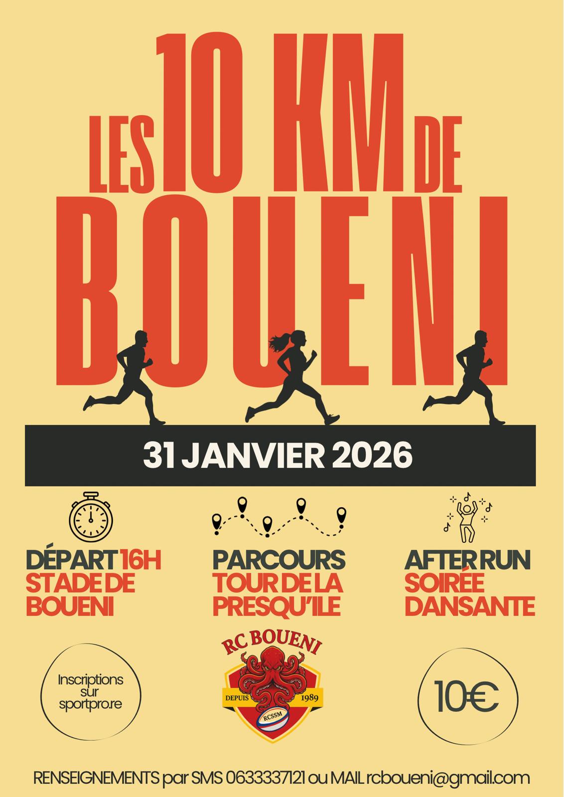 La course pédestre intitulée « 10 km du RC Boueni » est organisée par le Rugby Club de Boueni (RC Boueni), association loi 1901, dans le cadre de la promotion de la pratique sportive.